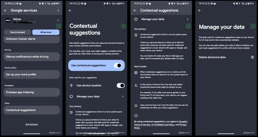 تشير Android Authority إلى أنه يظهر ضمن الإعدادات أن الاقتراحات السياقية تتم معالجتها محليًا بواسطة الجهاز وأن البيانات مشفرة. علاوة على ذلك، يتم حذف البيانات من الميزة كل 60 يومًا، أو يمكنك حذفها يدويًا بنفسك.